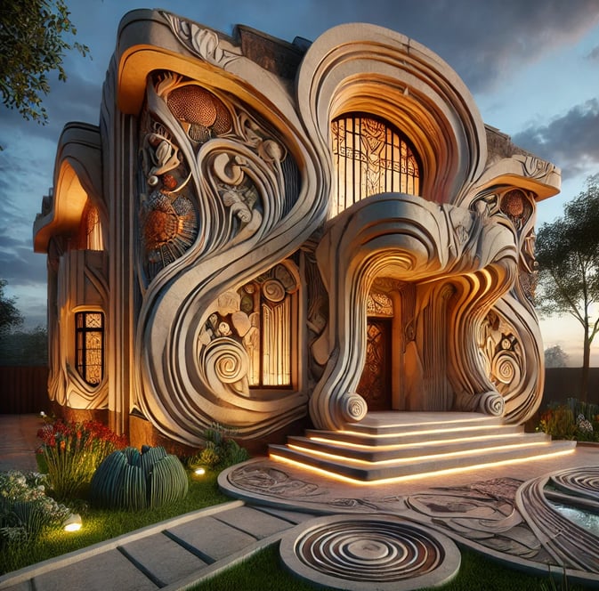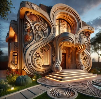 This modern Art Deco home blends organic curves with rich textures and bold, vibrant colors. The exterior is adorned with sculpted stone, warm bronze detailing, and stained-glass panels in jewel tones like emerald green, deep sapphire, and golden amber. Flowing balconies and rounded archways soften the geometric elements, creating a seamless, elegant form. The grand entrance, framed by intricate sculptural columns, opens into a warmly lit interior that echoes the exterior’s luxurious craftsmanship. A lush, sculpted garden with cascading water features and winding stone pathways completes the serene and opulent setting.