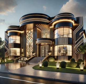 This modern Art Deco home features a striking curved facade with sleek glass walls and bold geometric accents. The exterior is painted in a sophisticated mix of deep navy blue, burnt orange, and gold, creating a vibrant and luxurious feel. A decorative fountain in the front yard and a rooftop terrace add to its grandeur, while strategically placed LED lighting enhances the structure’s curves at night. The entrance boasts a dramatic oversized doorway with intricate Art Deco patterns, making a bold statement. Surrounded by palm trees and exotic landscaping, this home exudes elegance and modern sophistication.